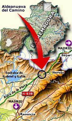 Aldeanueva del Camino está situada al norte de la provincia de Cáceres y al norte del Valle del Ambroz, a 524 m de altitud. Su superficie es de 19,70 Km2 y su casco urbano ocupa 21 Ha.